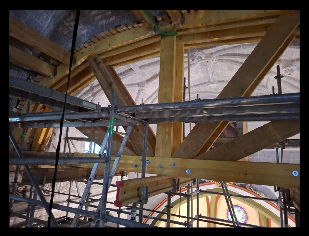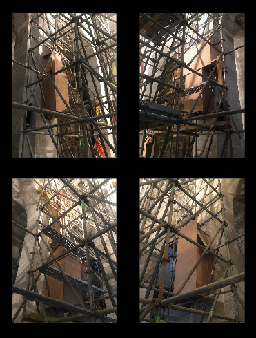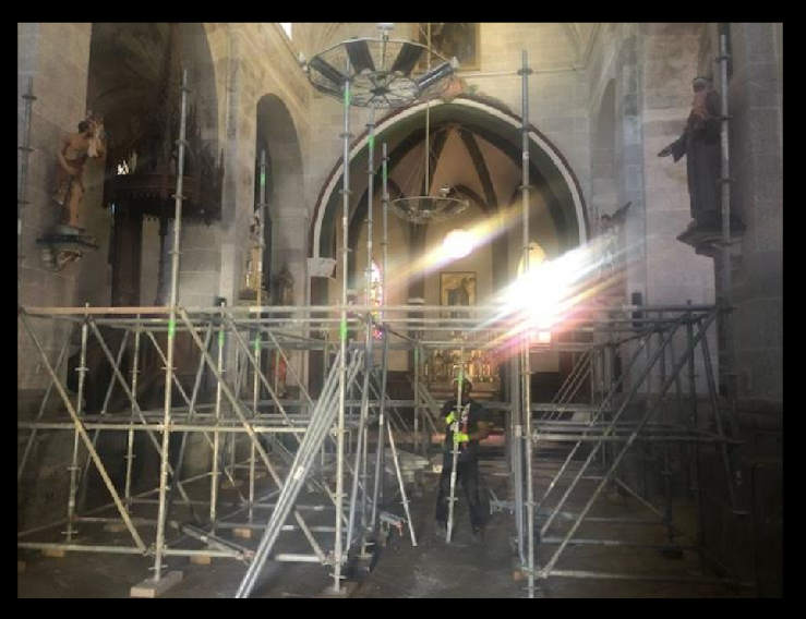 Le chantier commence par la construction d'un échafaudage à l'intérieur de la nef. Celui ci permettra d'accéder à la voute en vue des travaux de consolidation de cette dernière.