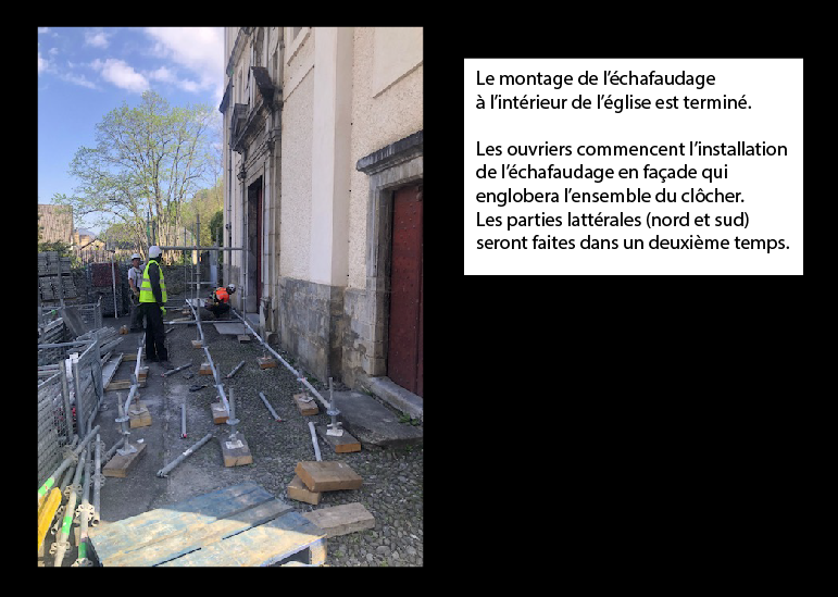 Il a été convenu que les cintres en bois devant soutenir les voûtes et livrés le 22 avril seront installés et en place pour le 7 mai. Les échafaudages extérieurs seront opérationnels devant le porche et autour de la nef début mai. La grue sera installée devant le portail de l'église début mai.